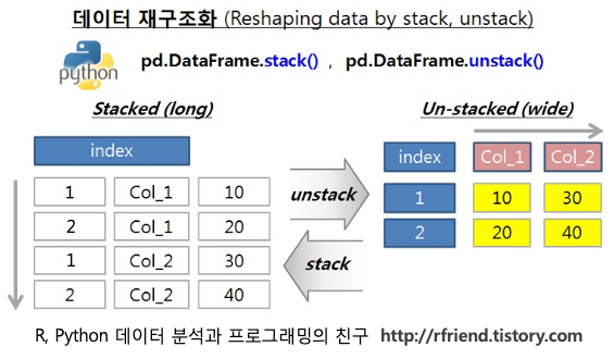 데이터프레임을 일종의 블록이라고 가정하면 stack과 unstack은 마치 블록을 쌓고 분해하는 역할을 하는 함수라고 생각하면 편합니다.