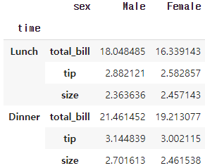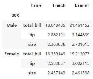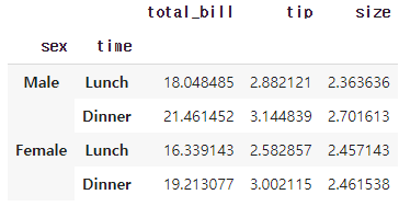 기본으로 제공하는 tips 데이터셋을 불러온 후 sex와 time을 이용해 groupby를 진행했습니다.